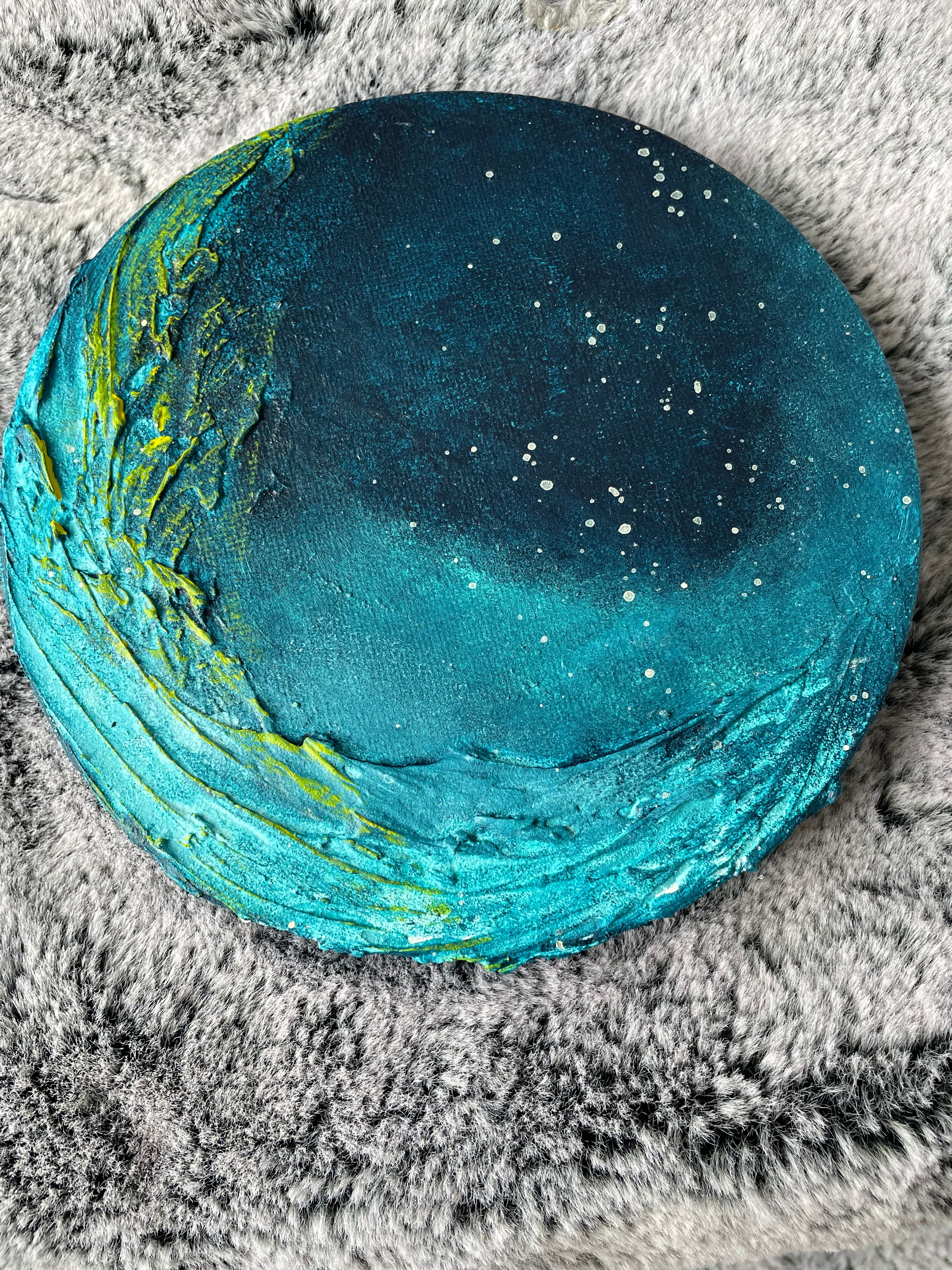 月をモチーフにした美しい円形テクスチャーアート、月アート 15cmです。心地よい色合いと異なるテクスチャーが施されており、見る角度によってさまざまな表情を楽しむことができます。