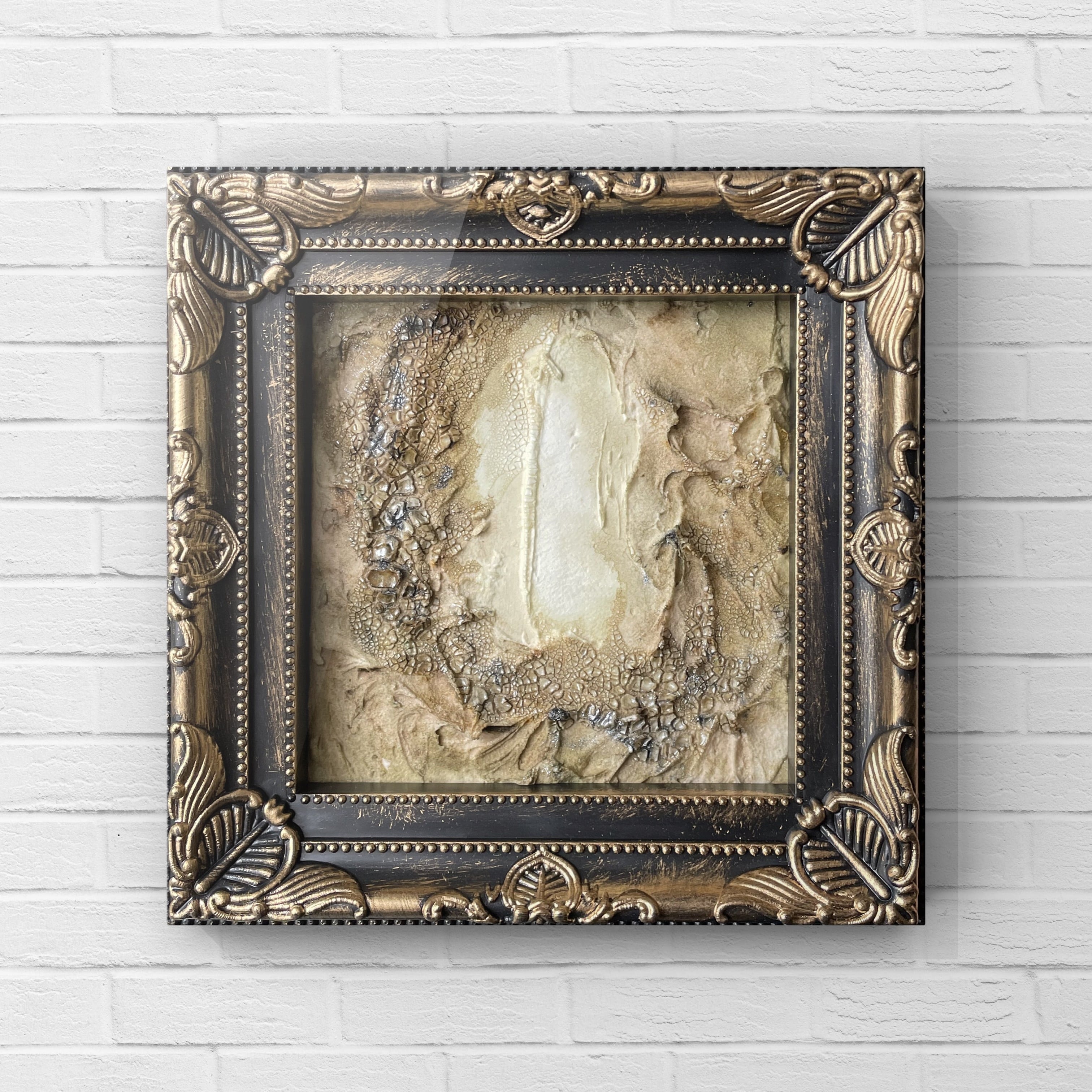 テクスチャーアートの抽象画です。 ゴールドのアンティーク調フレームに収められており、インテリアのアクセントに最適です。立体的なテクスチャーが特徴で、光の当たり方によって様々な表情を見せてくれます。 お部屋やトイレ、玄関にいかがですか 【カテゴリ】絵画 【カラー】ゴールド系、ベージュ系 【サイズ】約12㎝スクエアタイプ(フレーム含む) 【素材】アクリル絵具