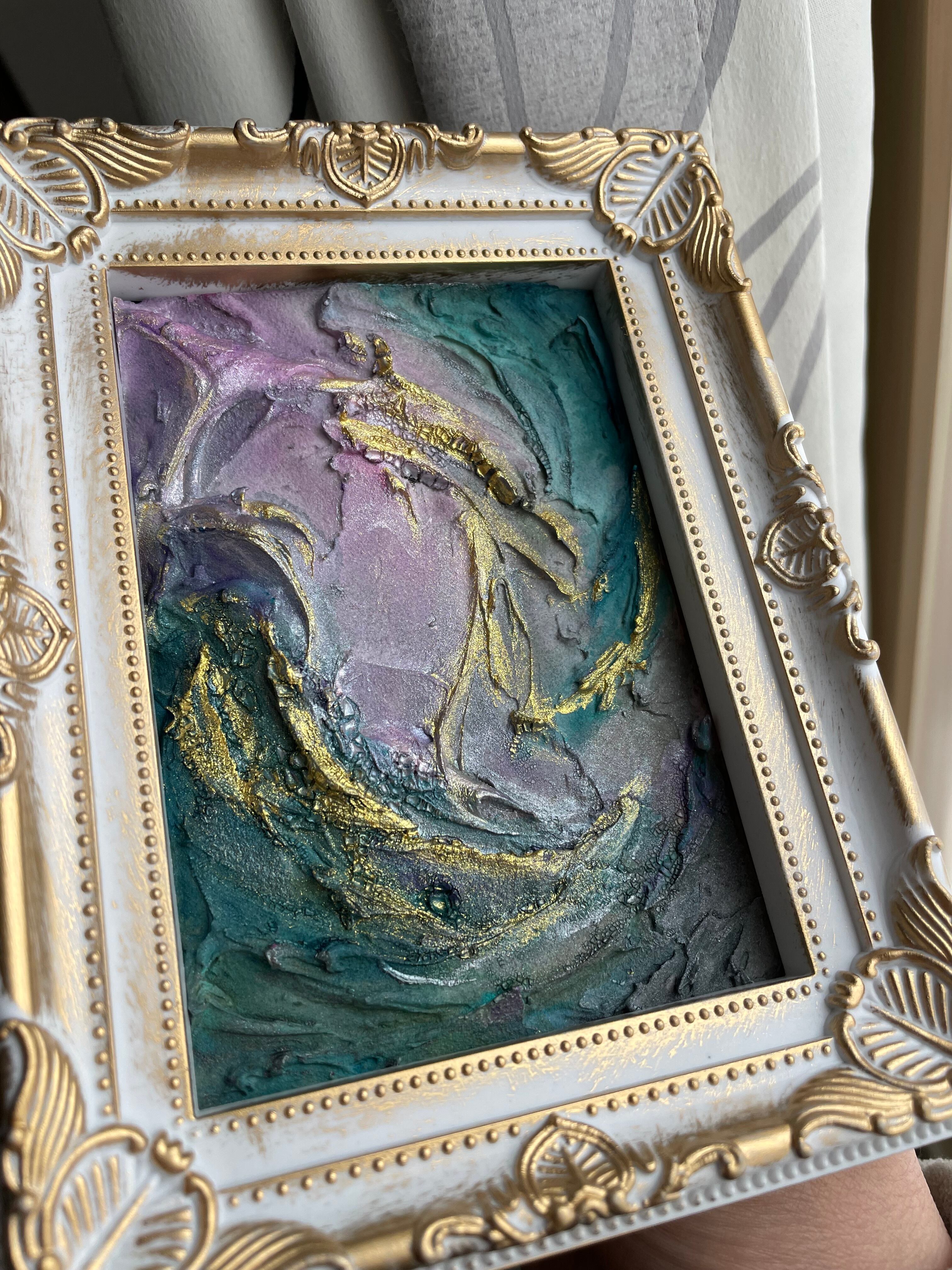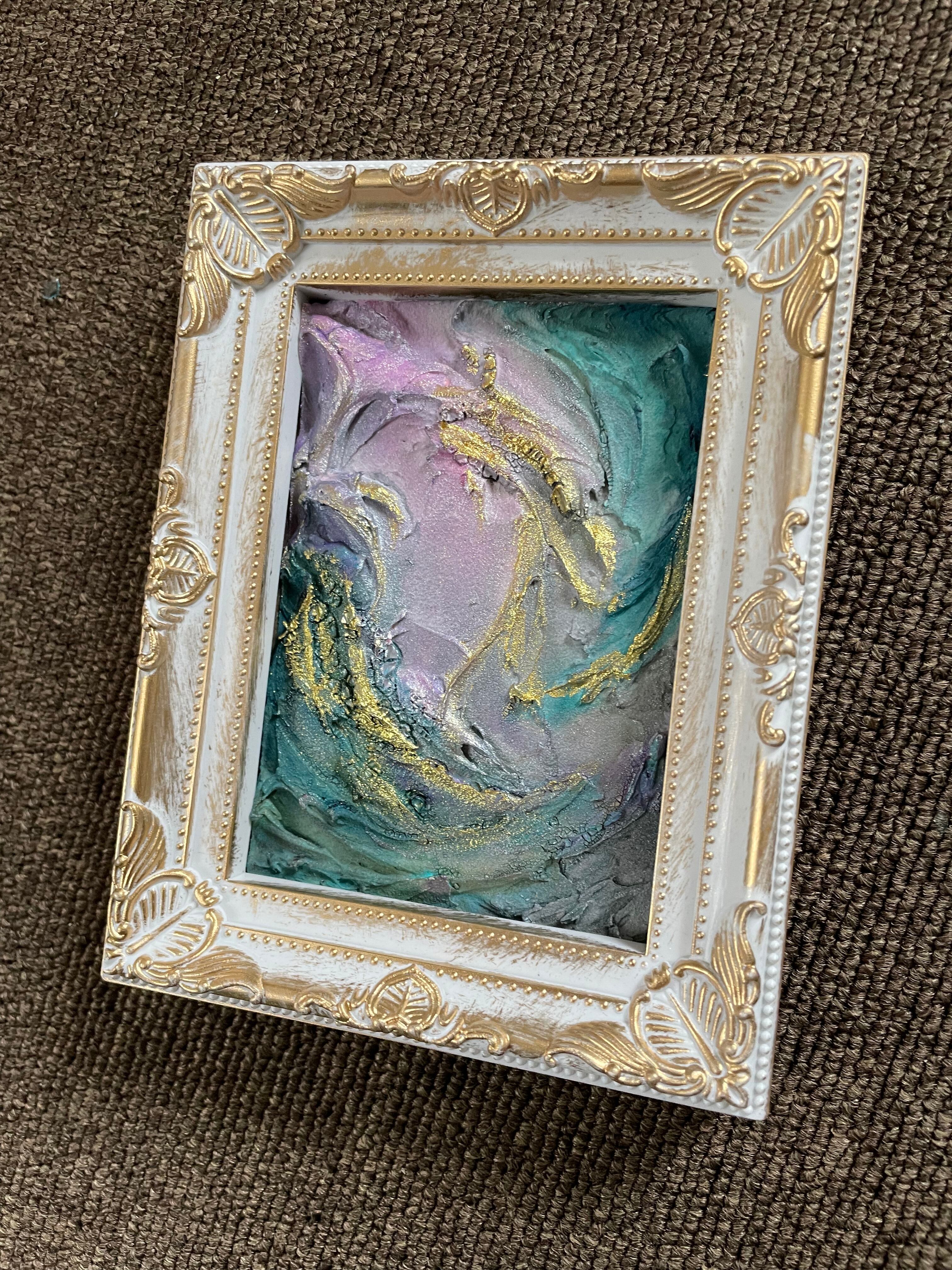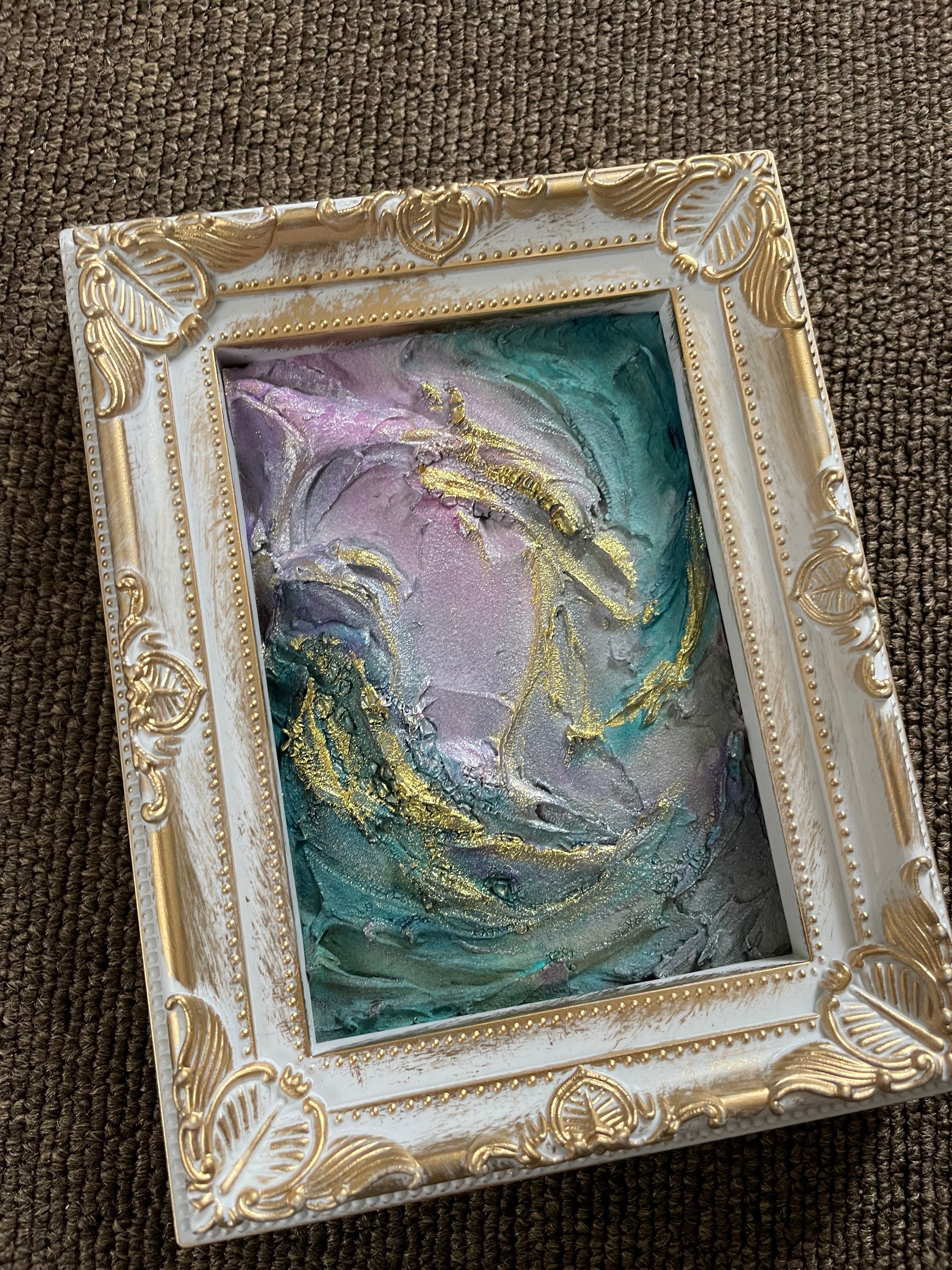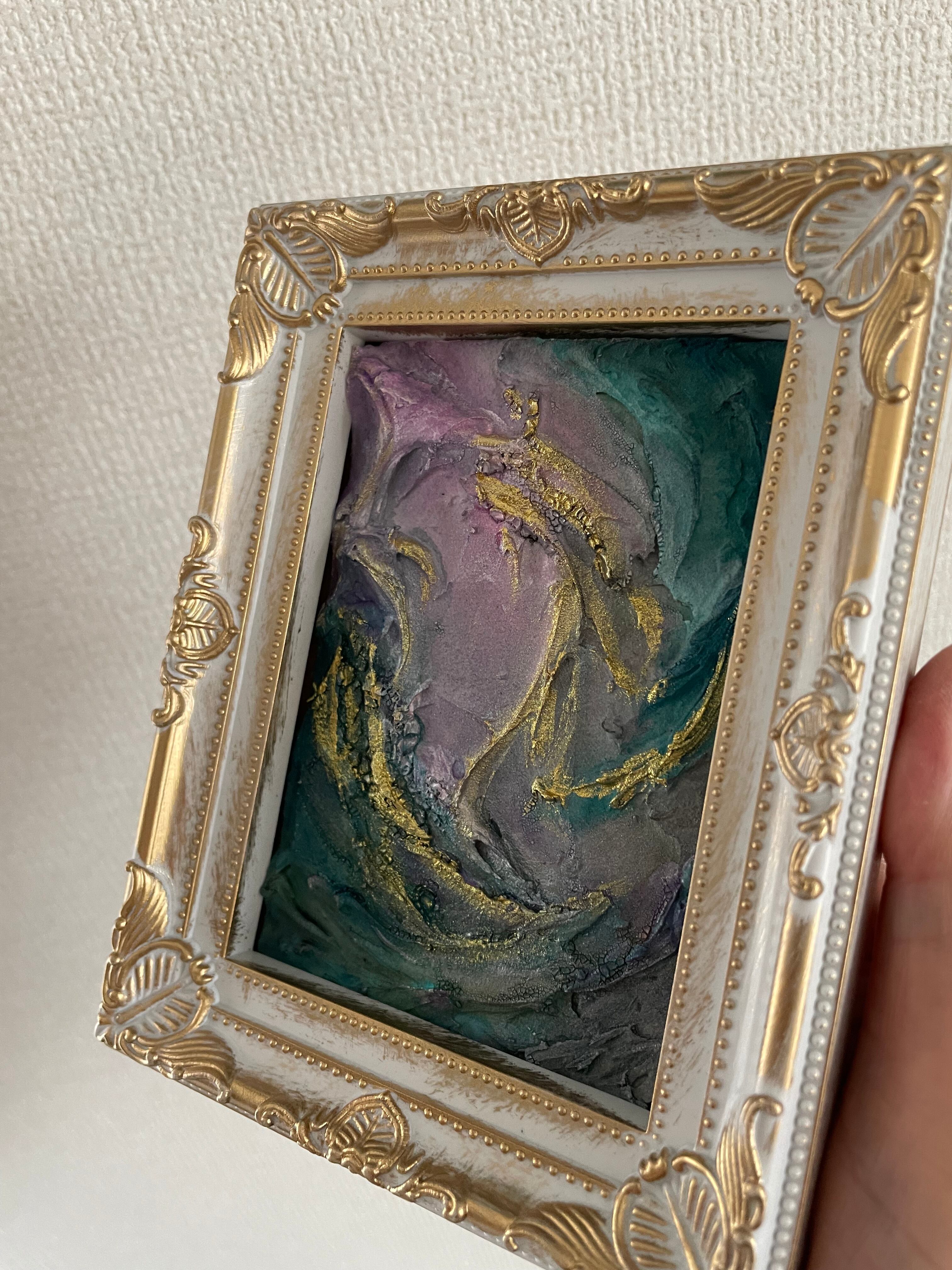 立体的なテクスチャーが特徴の抽象画です。ゴールドのアクセントが施されており、光の当たり方で様々な表情を見せてくれます。インテリアのアクセントとして、お部屋を華やかに彩ります。 【商品の状態】未使用 【カラー】マルチカラー 【サイズ】縦15㎝横12㎝(額装込み)