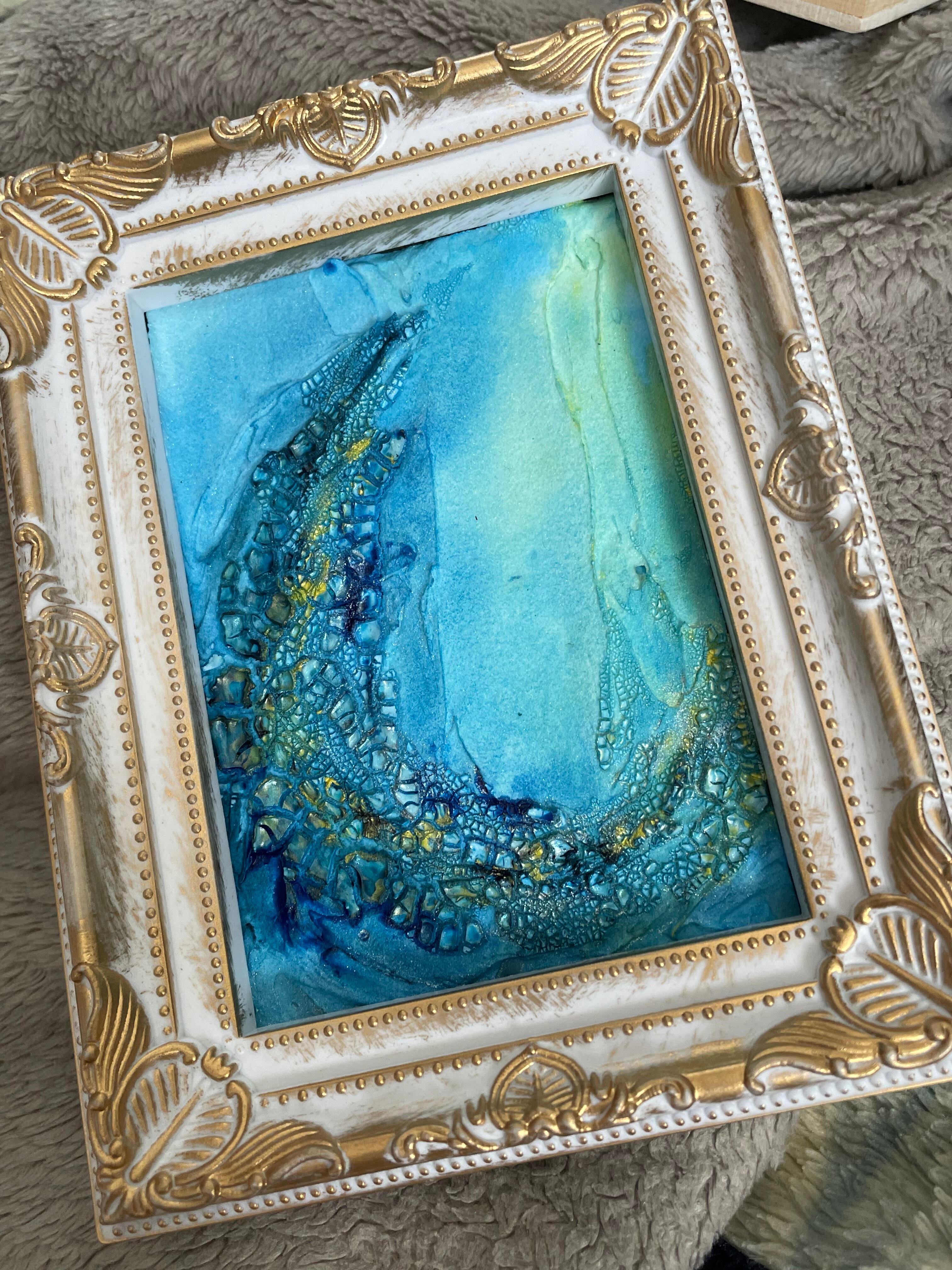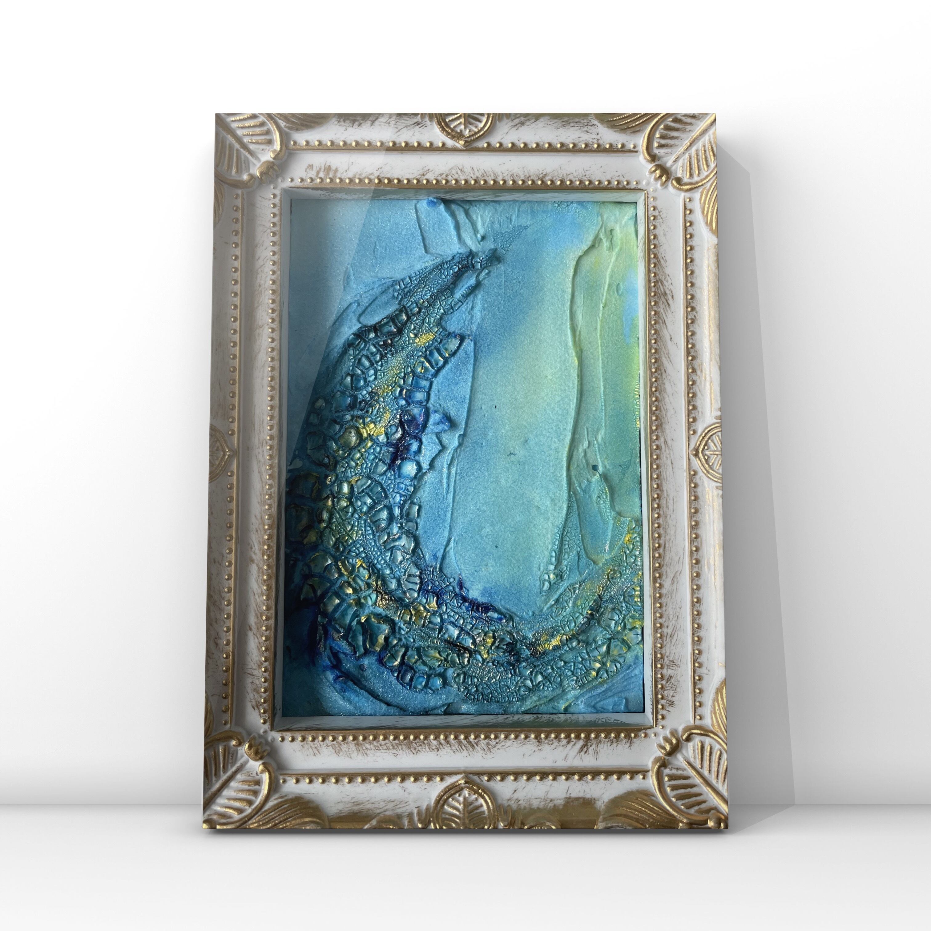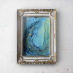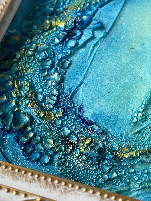 青を基調としたテクスチャーアートの抽象画です。海の波や水面を思わせるような立体的な表現が特徴で、ゴールドのアクセントが光の反射を美しく見せています。卓上にも飾りやすいサイズで、お部屋のインテリアのアクセントになります。
