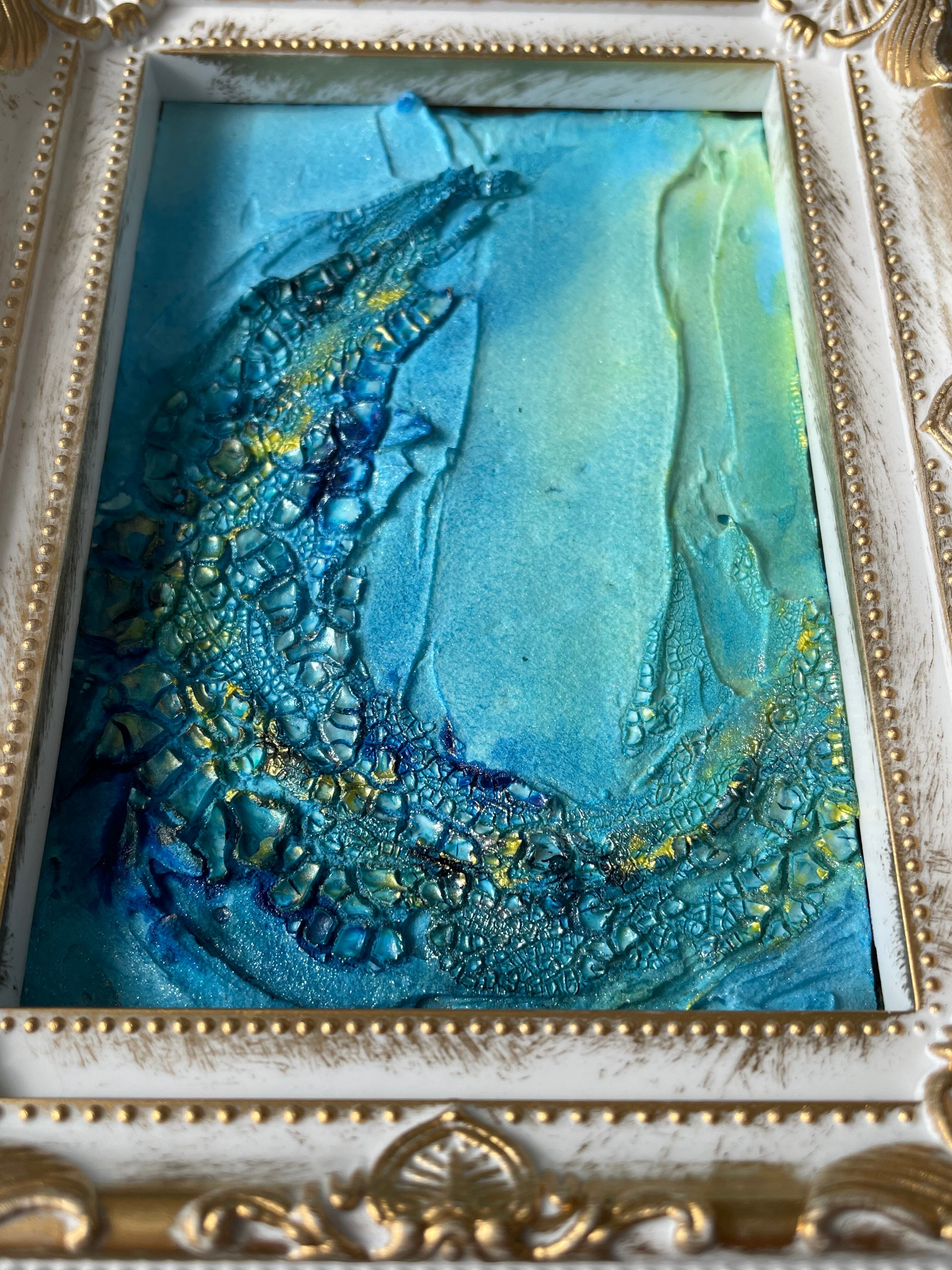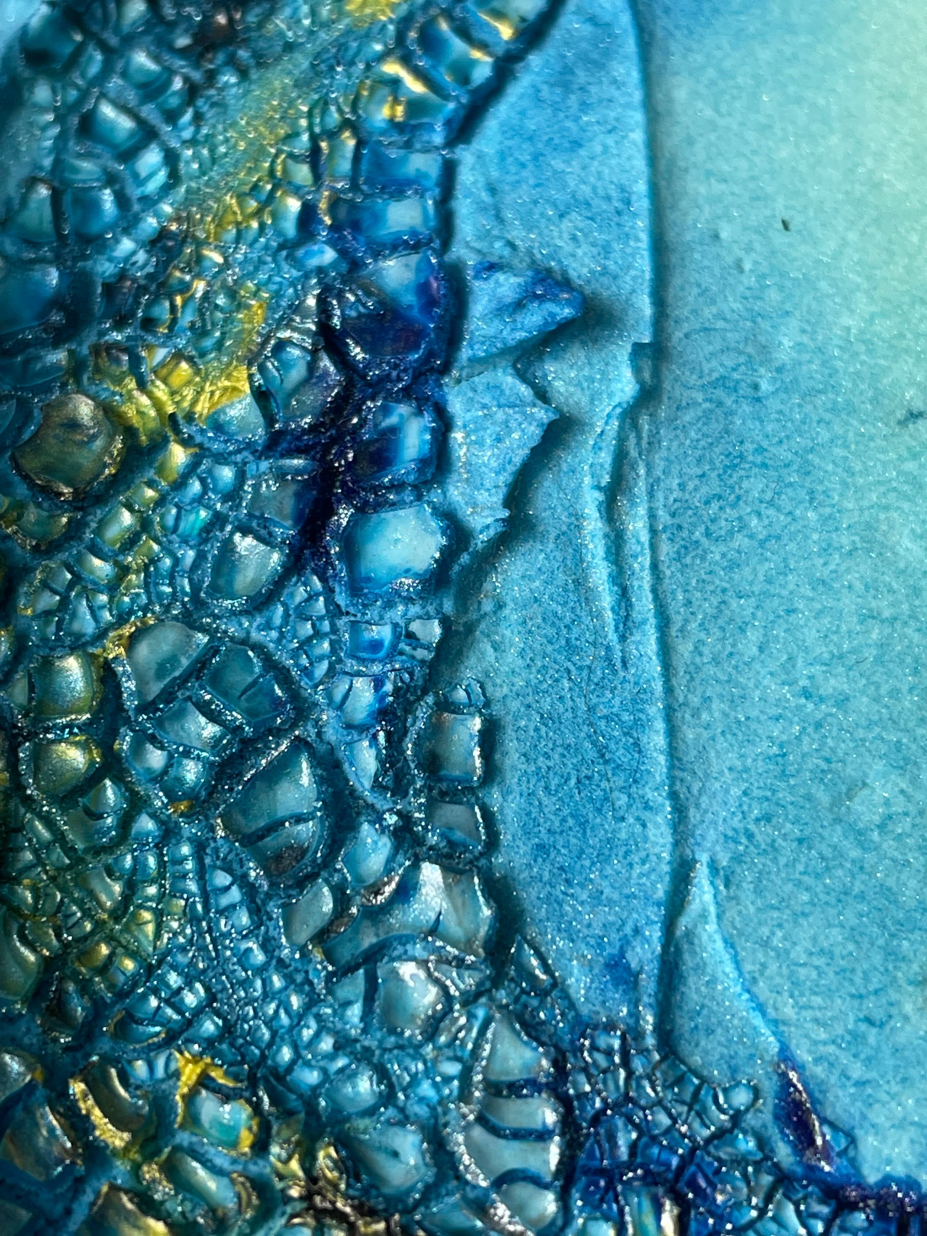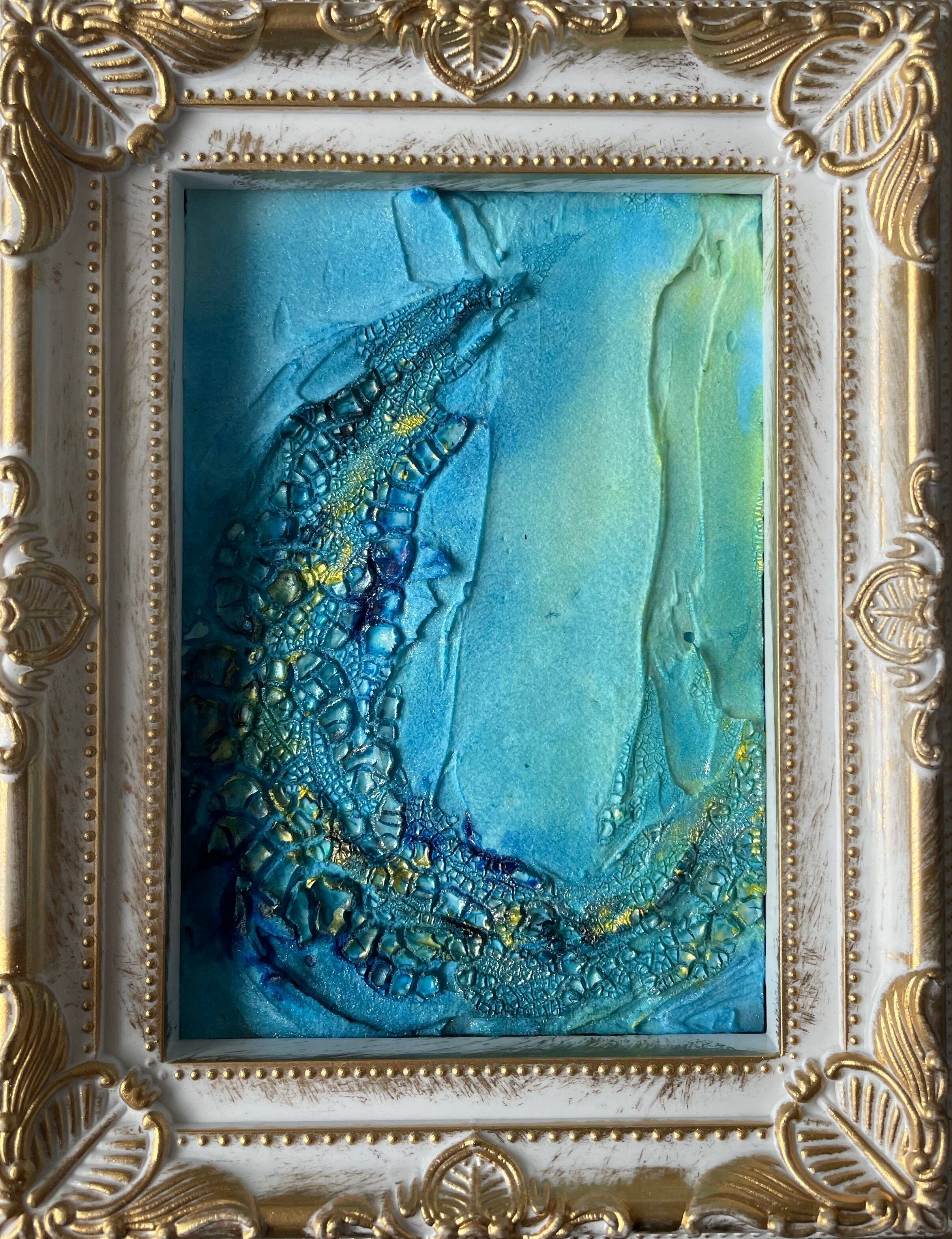 青を基調としたテクスチャーアートの抽象画です。海の波や水面を思わせるような立体的な表現が特徴で、ゴールドのアクセントが光の反射を美しく見せています。卓上にも飾りやすいサイズで、お部屋のインテリアのアクセントになります。
