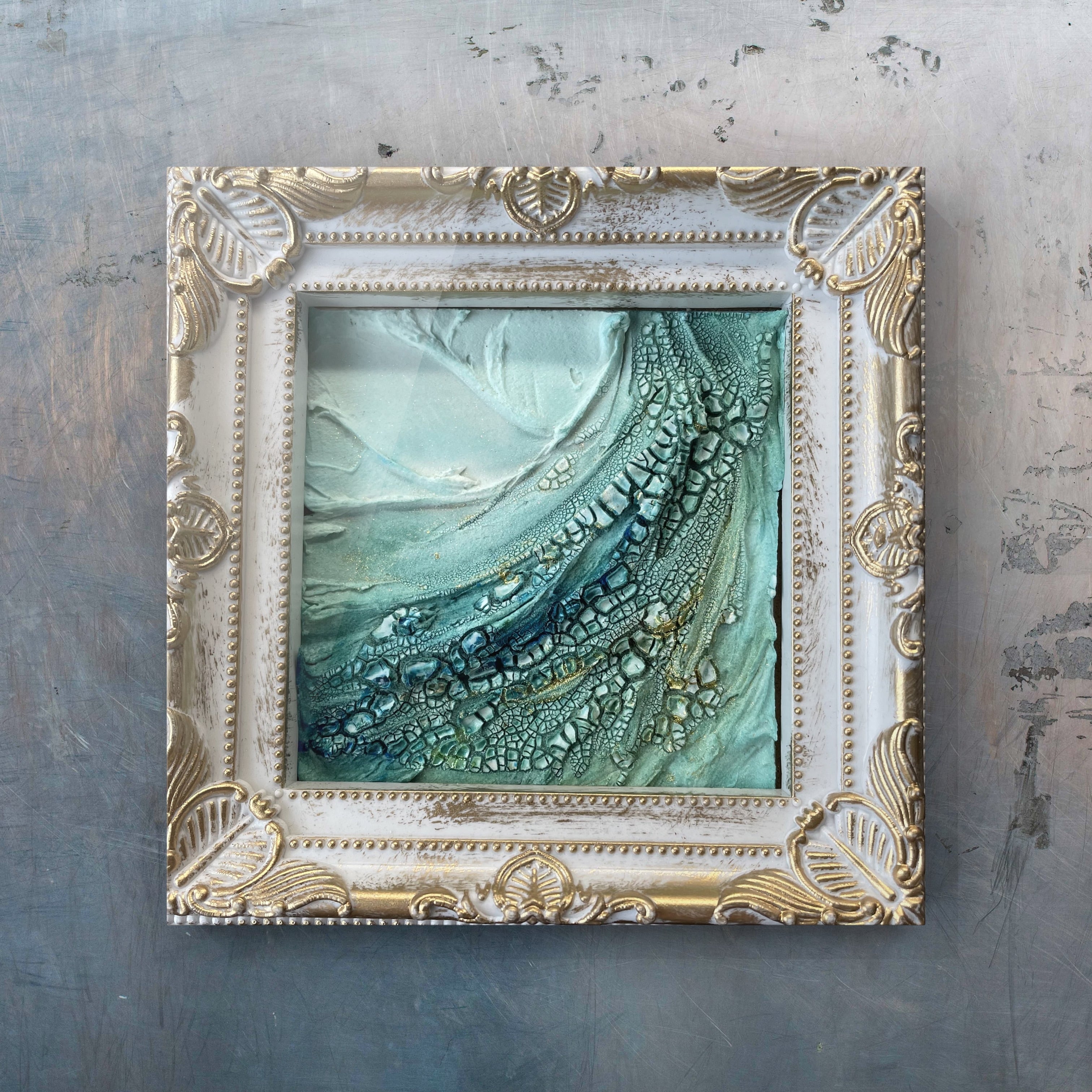 海をモチーフにしたテクスチャーアートの抽象画です。立体的な表現が特徴で、卓上アートとしてもお楽しみいただけます。一点物のオリジナルアートで、お部屋のアクセントにいかがでしょうか。