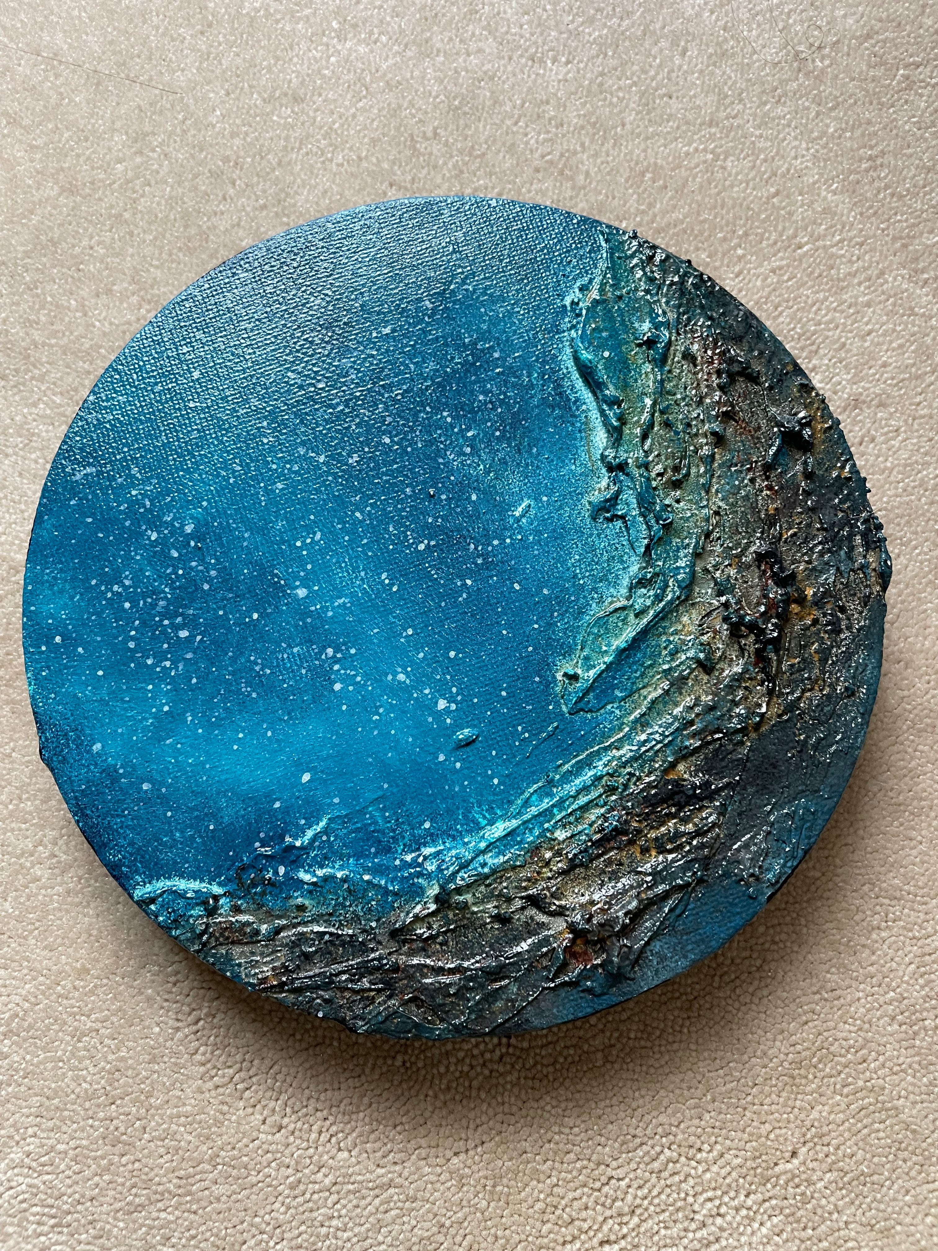 空アート。 直径15cmの張りキャンバスにテクスチャーアートで作成しました。 青の深みや、凸凹のテクスチャーを楽しんでいただきたいと思います。 仕上げに艶ありスプレーニスを塗布しました。 側面はブラックを塗り、作品が締まるようにしました。 裏面には作品名とサインを書いてお届けします。 お部屋にいかがですか?