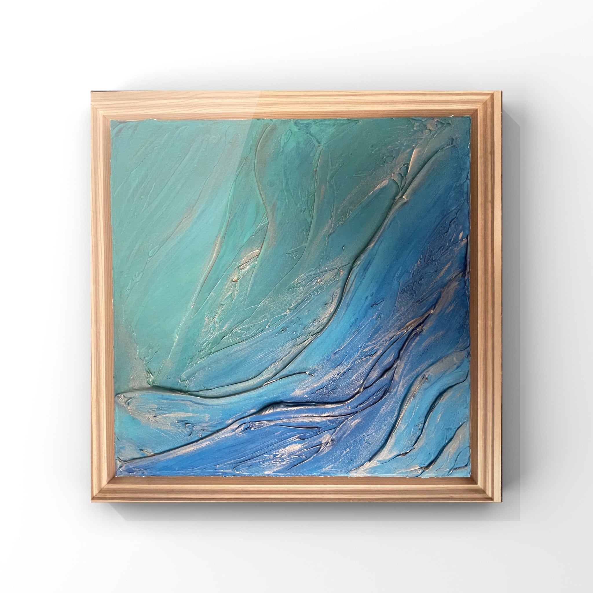 透明感のある絵に仕上げたく、キラキラ光るメタリックの絵の具も使っておりますので、角度によって光って見えます。側面は白を塗っておりますので爽やかな一枚に仕上がりました。